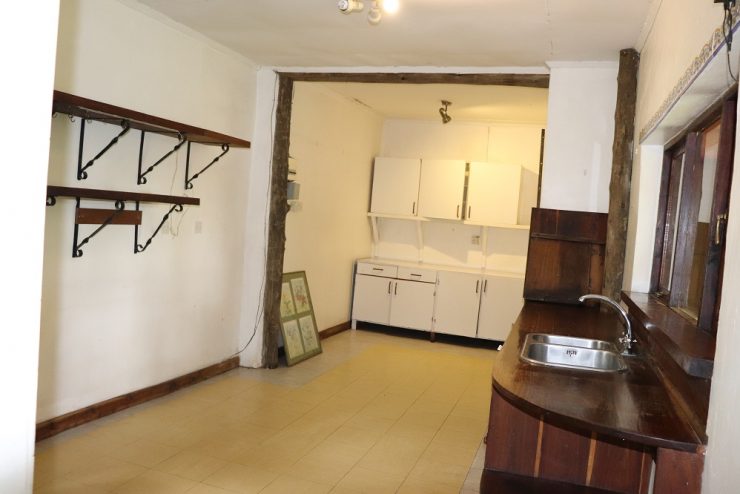 - Kitchen with inbuilt drawers, kitchen sink, tap.